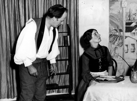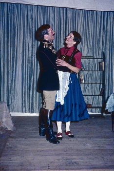 Here are a selection of copies of slides taken at a production of George Bernard Shaw's Arms and the Man. Directed by Joan Butler of Stockleigh English, the cast included my mother, Audrey Hotchkiss, as the maid, Louka, and my step-father, Barty Hotchkiss, as the soldier, Bluntschli. Hovering the cursor over them shows a larger image.