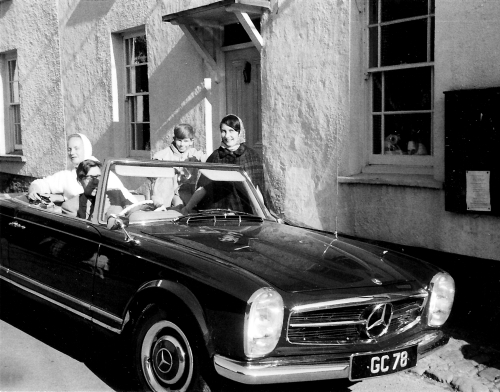 Bill Chancellor (driving), Vivien Gough-Cooper (in the back), me, and my mother (Audrey Hotchkiss) with V G-C's Merc.