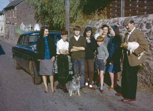 Barty's family, from left; Audrey Hotchkiss (wife), Jimmy Wood, Robert Hotchkiss (brother), Penny Hotchkiss (sister), me, Dorothy Hotchkiss (mother) with Ben (brother) in her arms, Jane Hotchkiss (sister) and John Hotchkiss (father) with Chancellor, one of his Jack Russell terriers, under his arm, one of our miniature Schnauzers on the ground.